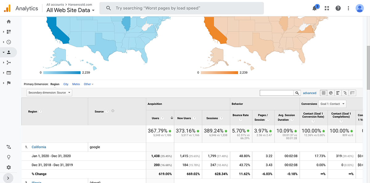 Hansen Cold only had a handful of page one rankings in California and most of their traffic was branded.
