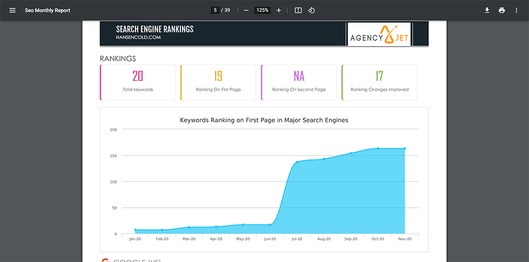 Even though Agency Jet only targeted 20 primary keywords for the campaign, Hansen Cold went from <5 number 1 rankings to 96 in twelve months.