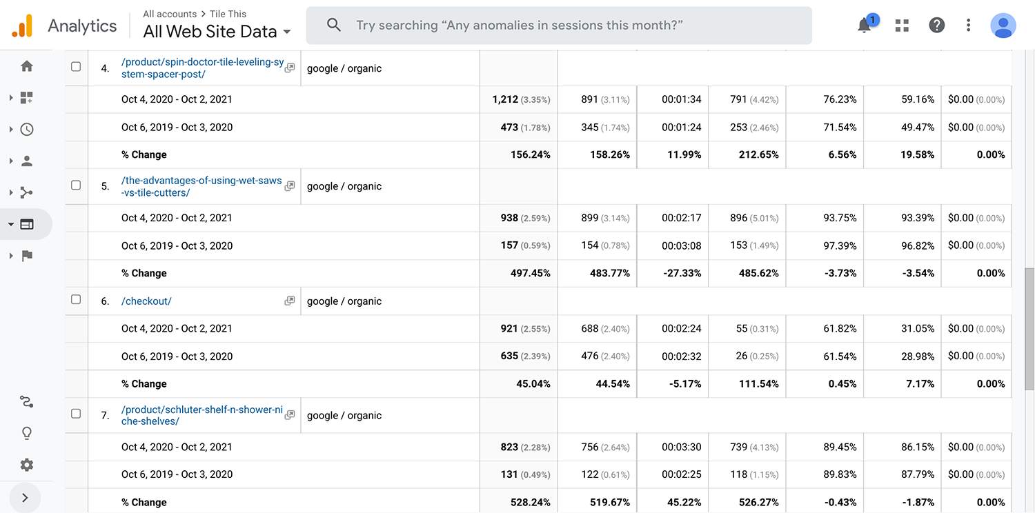 Tile This’s “wet saws” page saw 497% more visits from organic traffic in year two than it did in year one.