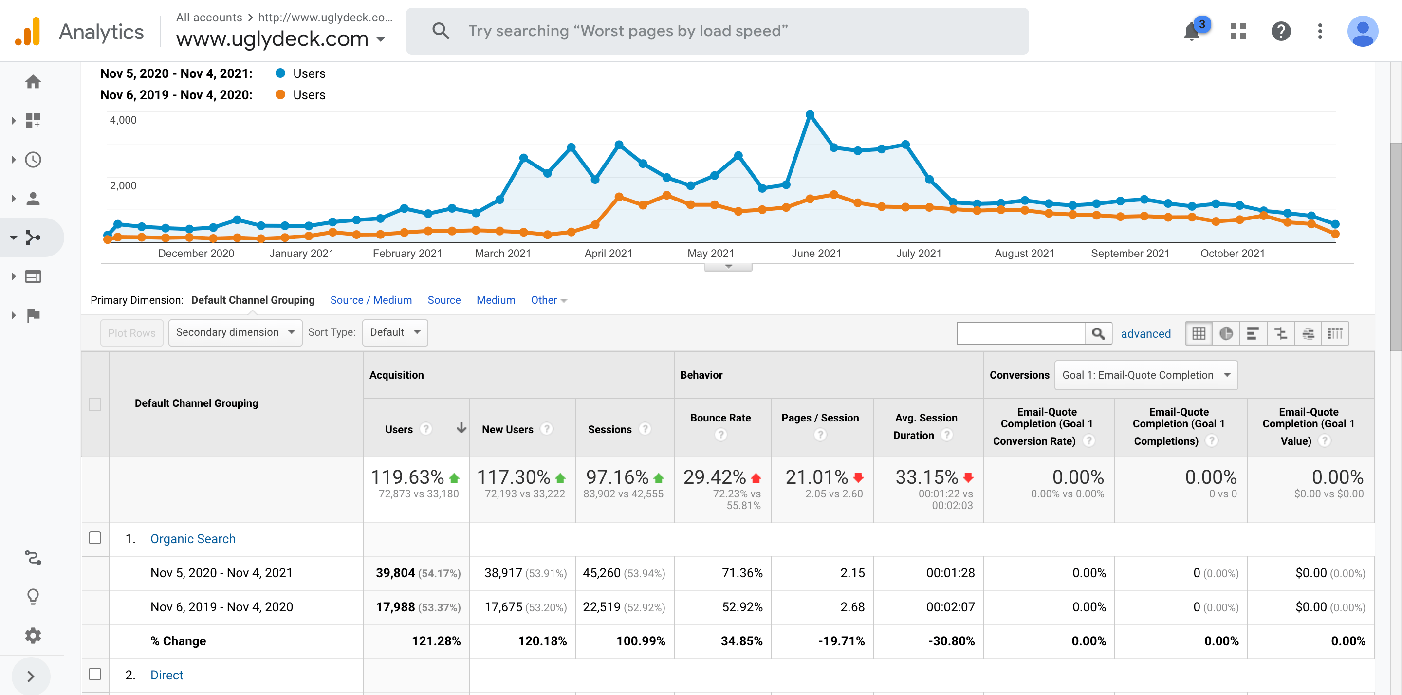 At the 1 year mark, UglyDeck was averaging 2000 more people per month from organic page 1 keywords than they had at the start.