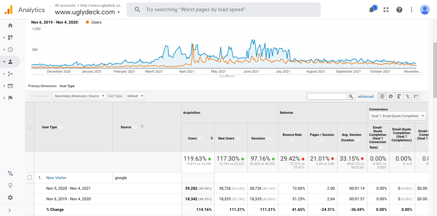 Prior to working with Agency Jet, UglyDeck had never exceeded 19K new organic visitors in a year. 1 year in with Agency Jet and they’d doubled their previous high.