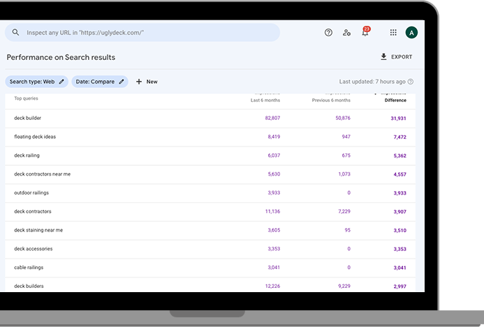From the first 6 months of the SEO campaign to the second 6 months, UglyDeck showed up 31K more times for the keyword “deck builder”.